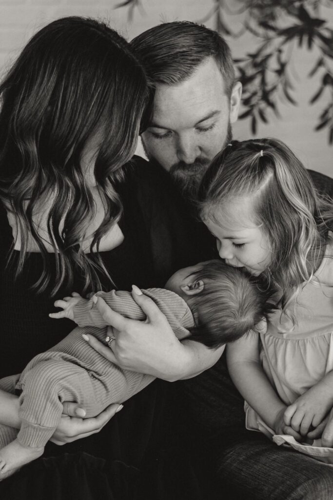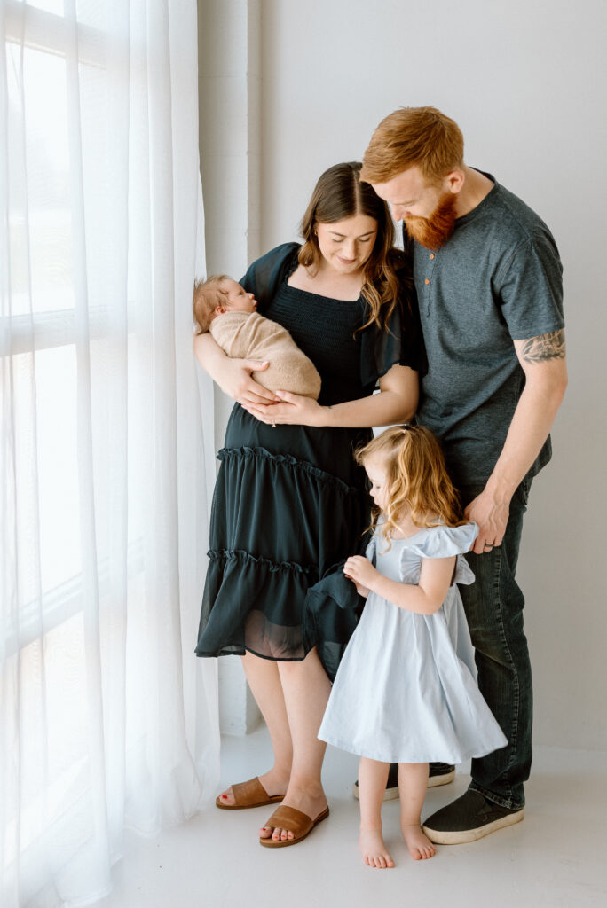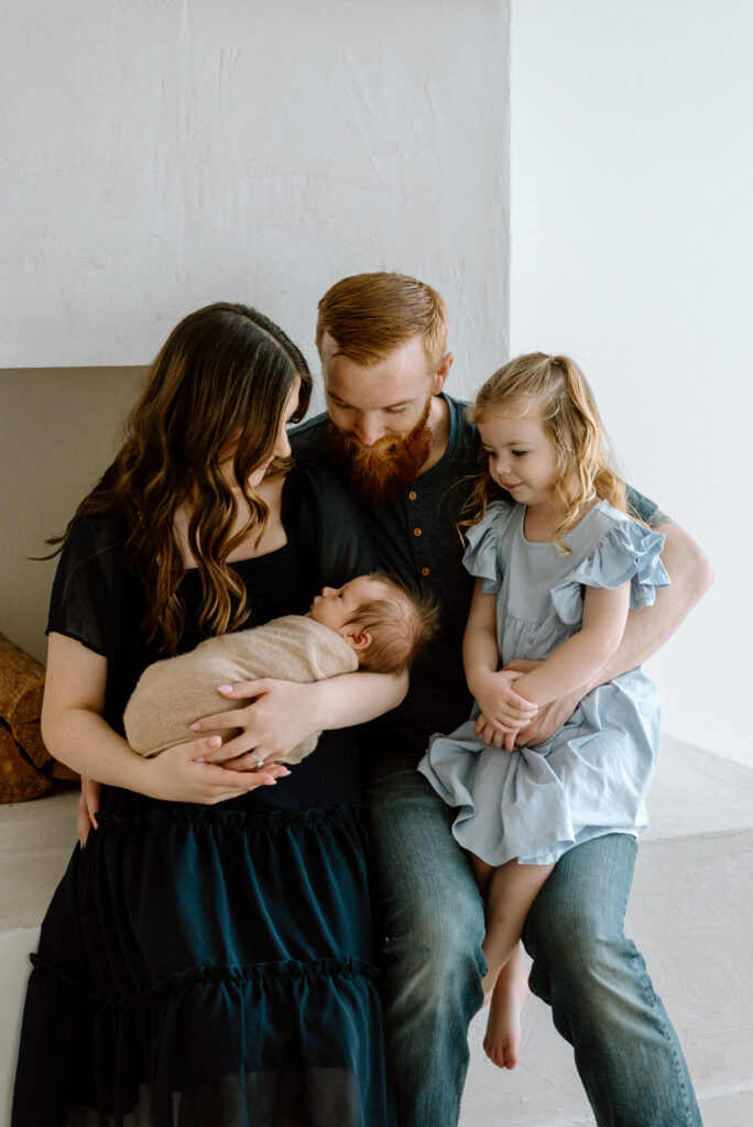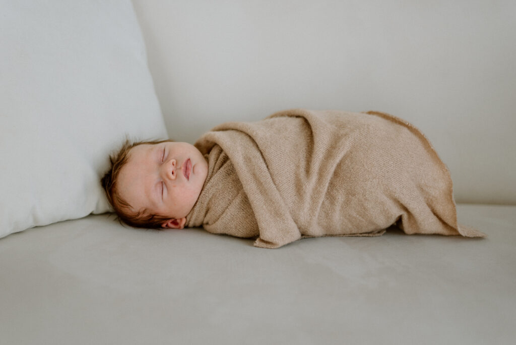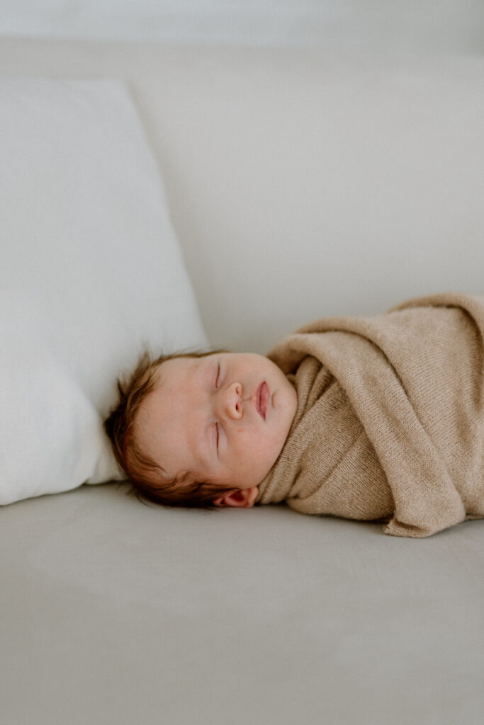 We started with him in a simple outfit, capturing those early details and connection with mom, dad, and big sister. Then I gently wrapped him in one of my go-to neutral beige swaddles.