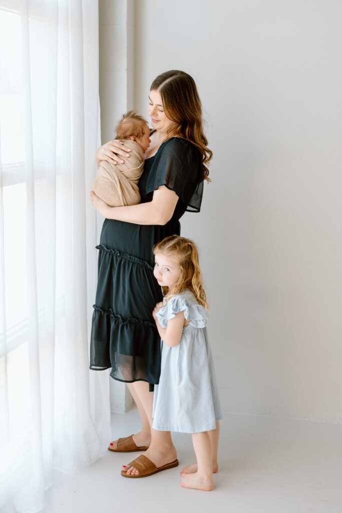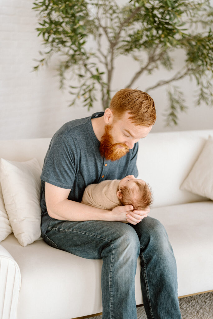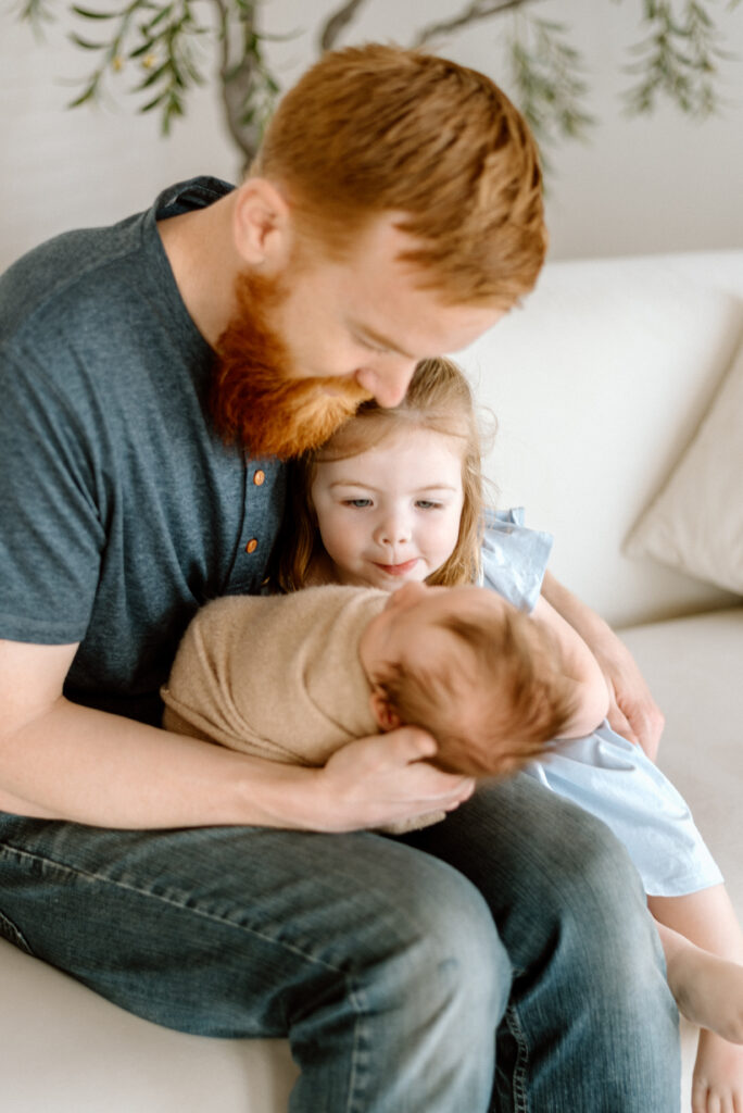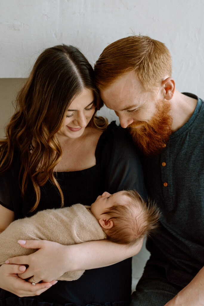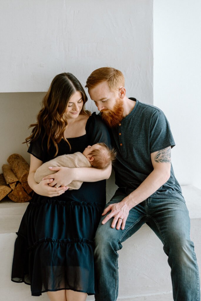 We started with him in a simple outfit, capturing those early details and connection with mom, dad, and big sister. Then I gently wrapped him in one of my go-to neutral beige swaddles.